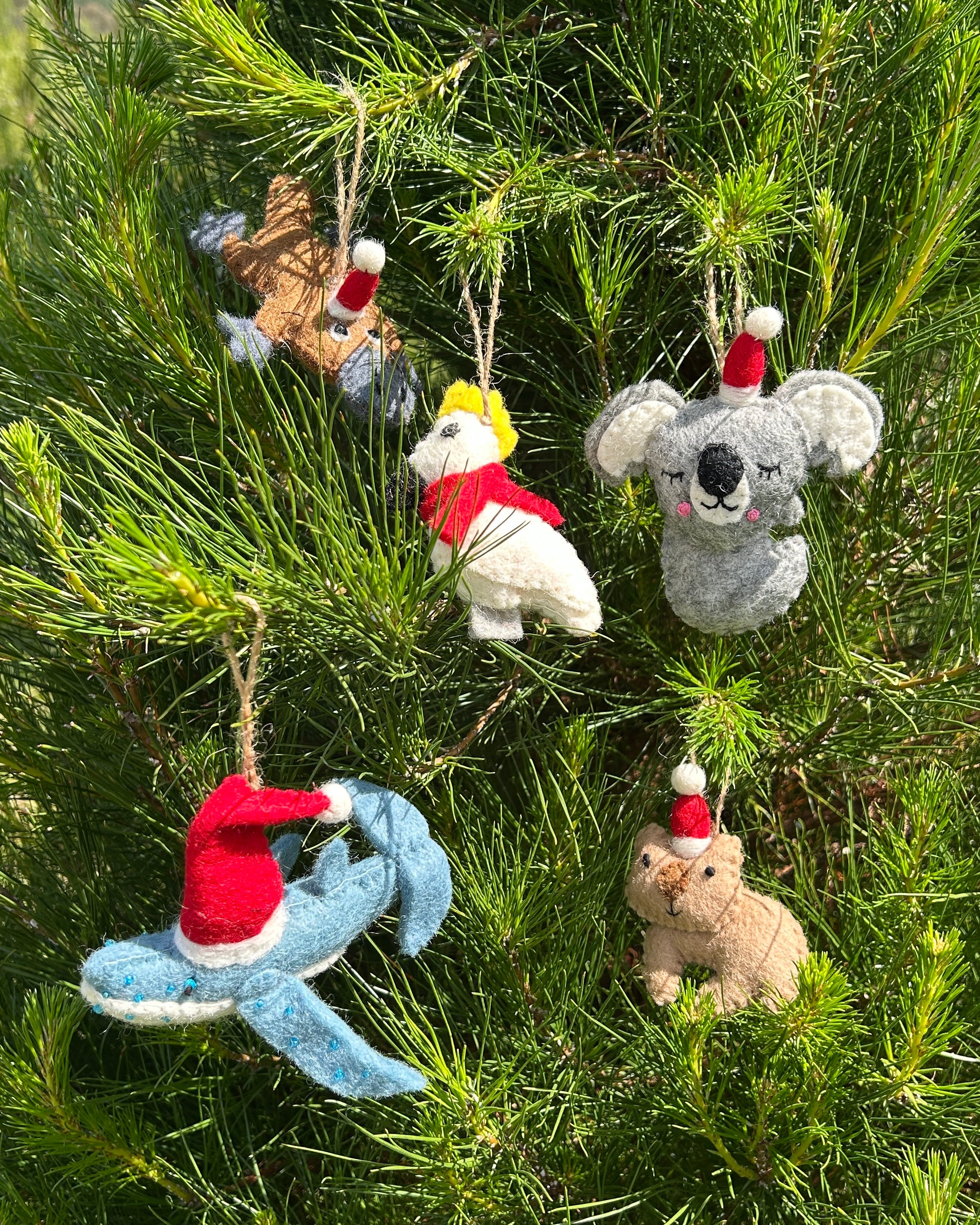 Bring a touch of Australian magic to your Christmas tree with our native animal felt decorations. Here you've got 5 native animals all together: a Koala, a Wombat, a Platypus, a Cocky and Humpback Whale.  They're carefully hand-felted and sewn from soft New Zealand wool, each piece is full of texture, colour, and charm.