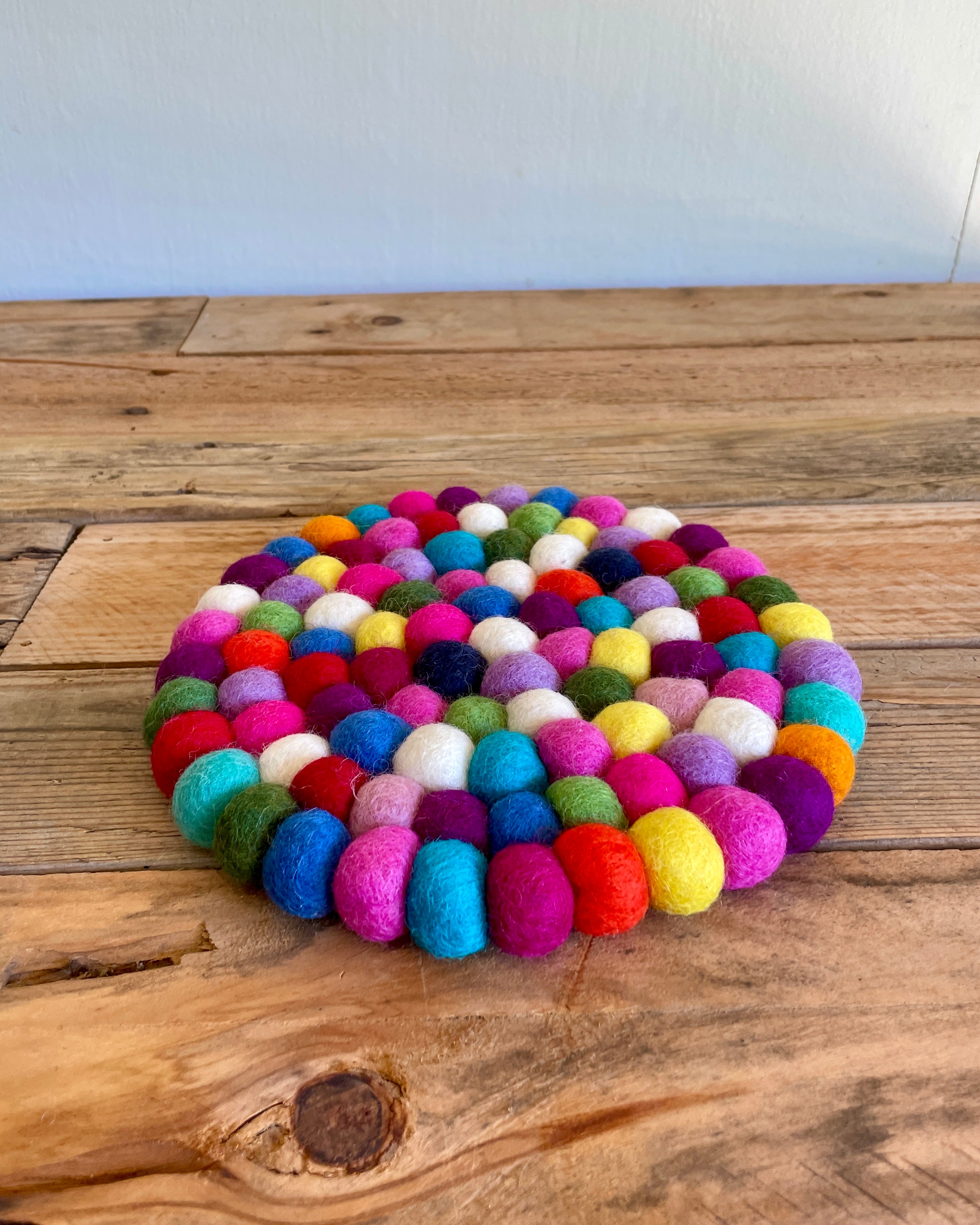 Brighten up your table with this multicoloured felt ball trivet.  Not only does it look great but it will protect your table from hot pans or teapots.
