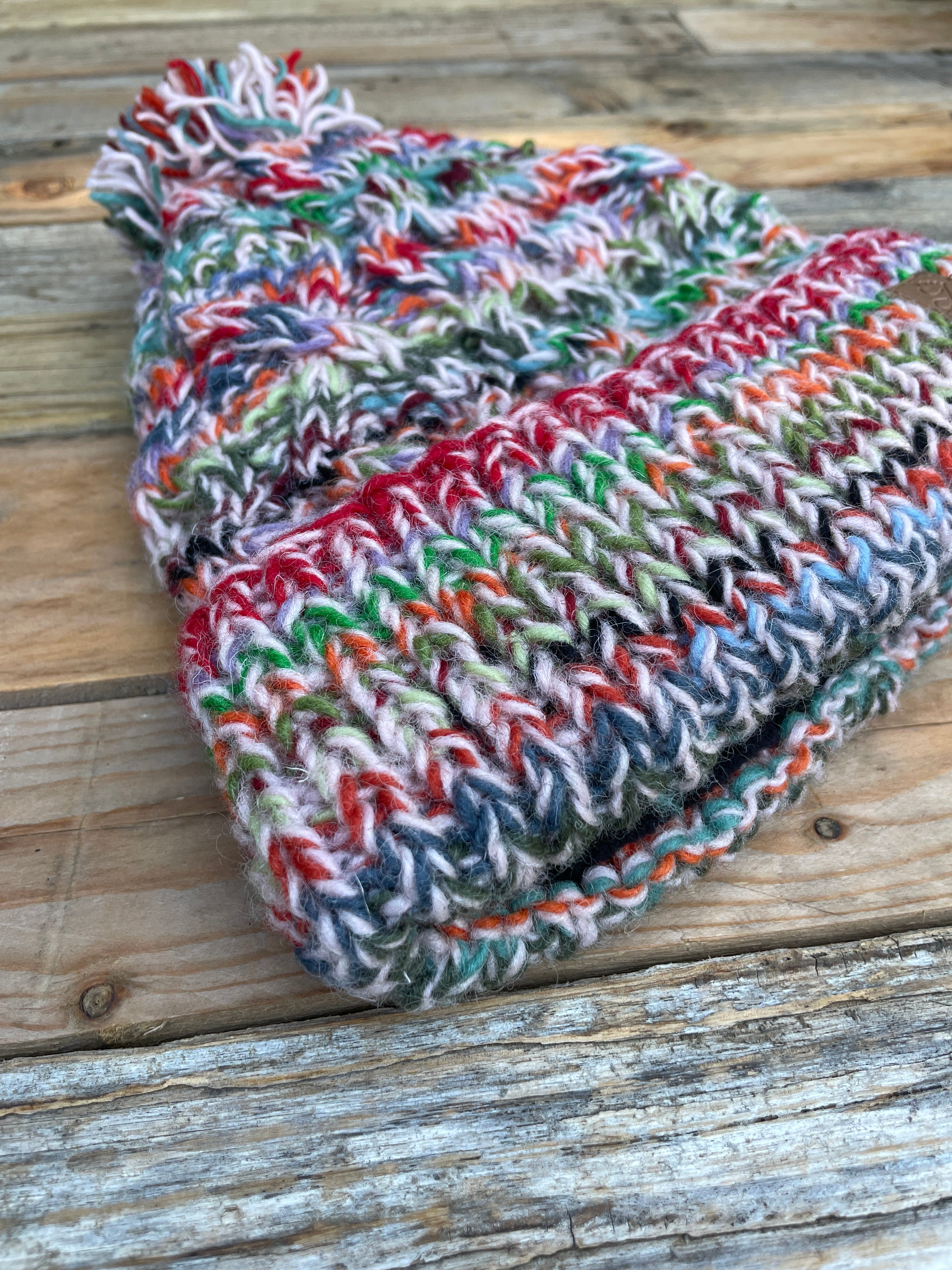 This bright and colourful beanie, with its pompom and cable knit, will cheer you up every time you put it on.  The multicolour knit means it goes with pretty much anything - so you'll be reaching for it all winter.  Hand-knit in Nepal from soft NZ wool it's ribbed turn up keeps it cosy around the ears and the fleece lining keeps the itch away and the warmth in.