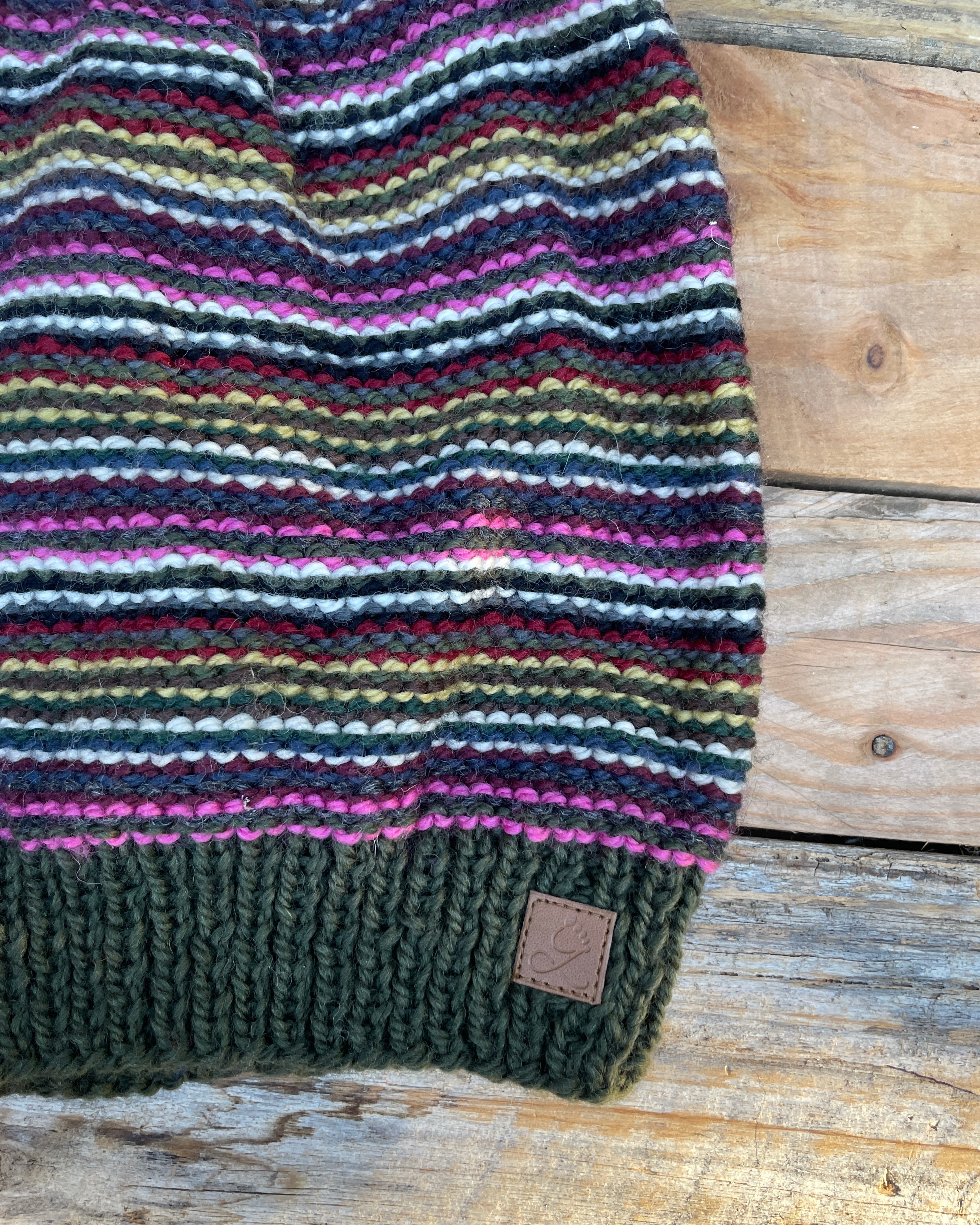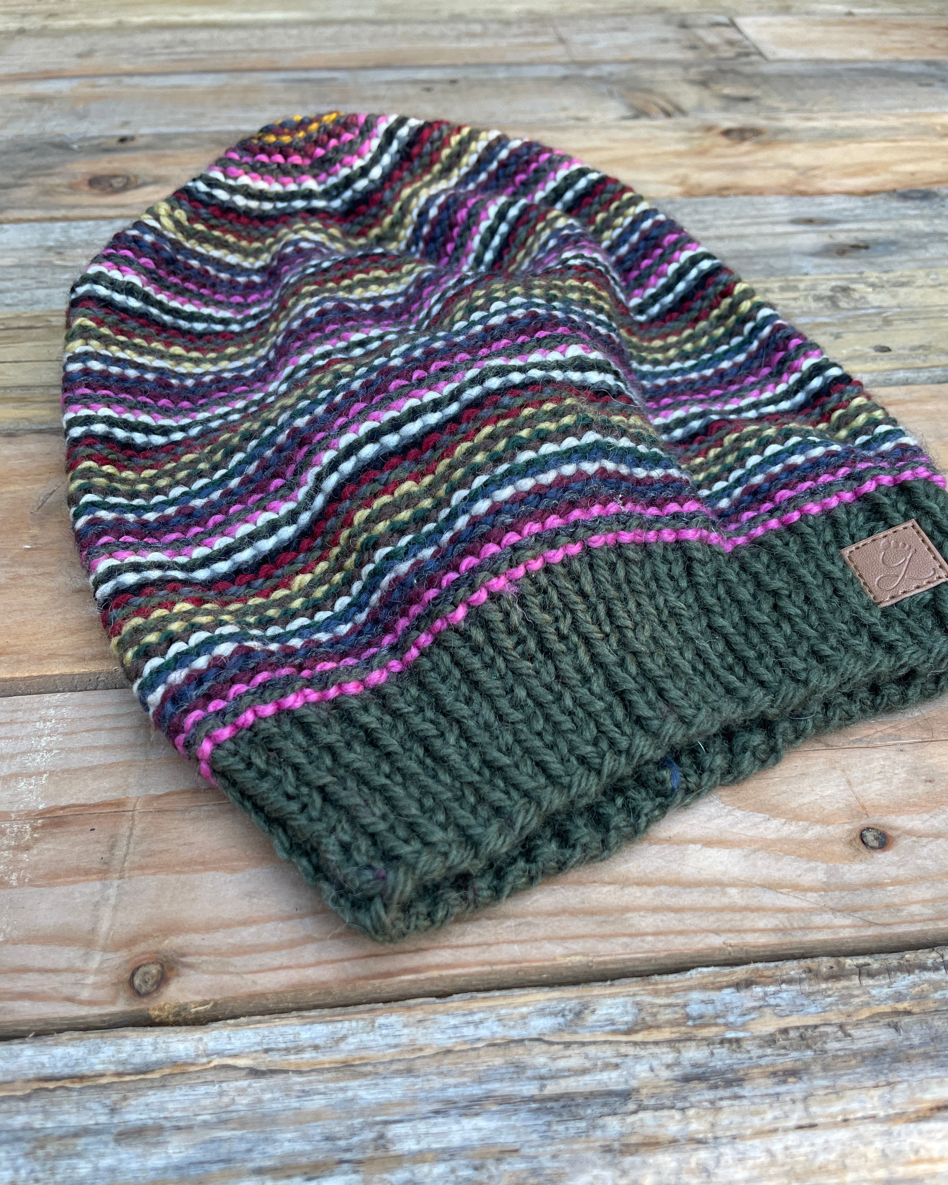 This stripy merino beanie is pure winter cheer — soft, warm, and ready for your next chilly walk. Hand-knit from super cosy New Zealand merino wool, it’s as comfortable as it is colourful. Wear it slouchy for a laid-back look, or turn up the brim for a snug, classic fit. However you wear it, you’ll stay toasty (and look great doing it).