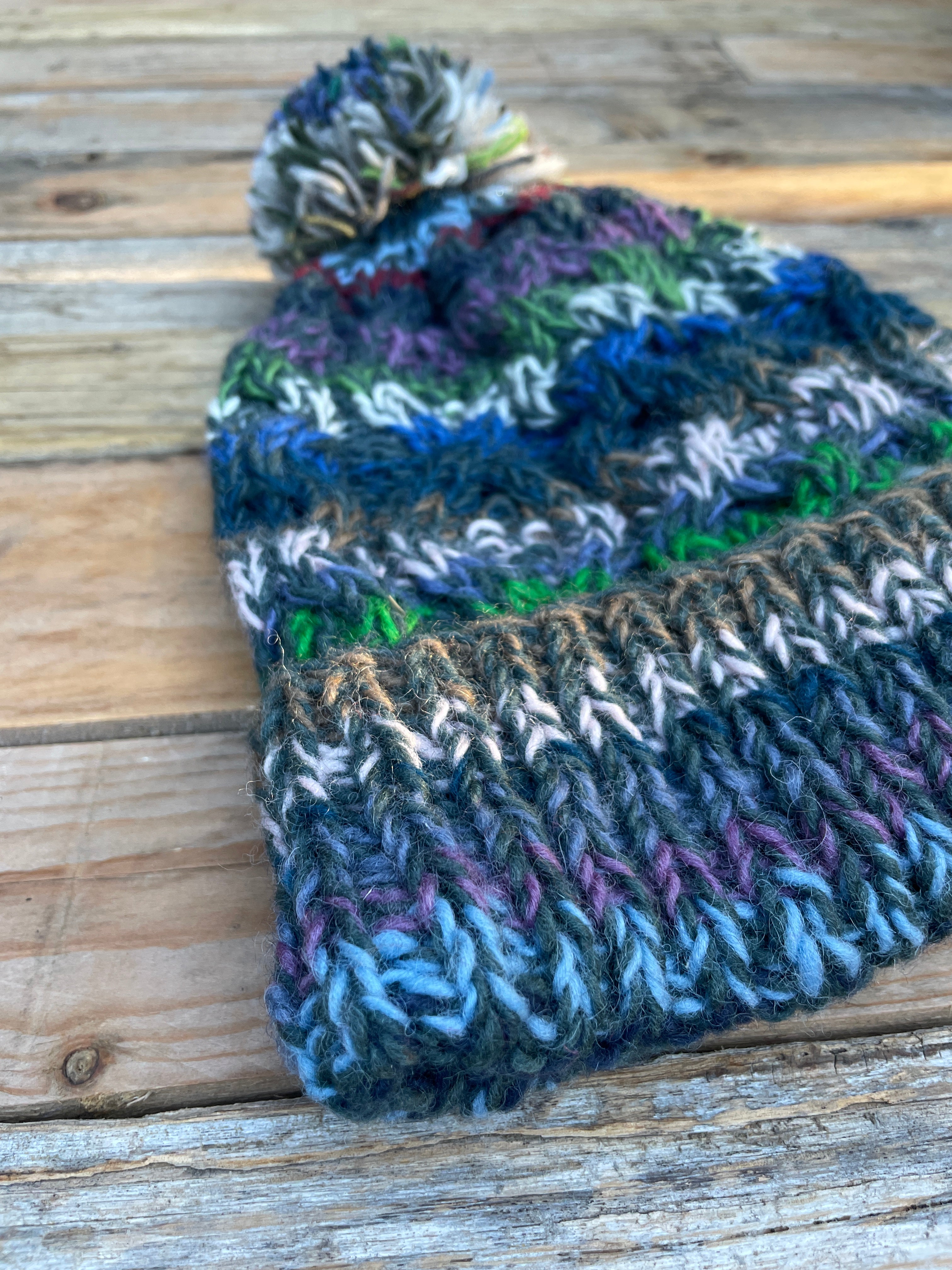 This bright and colourful beanie, with its pompom and cable knit, will cheer you up every time you put it on.  The multicolour knit means it goes with pretty much anything - so you'll be reaching for it all winter.  Hand-knit in Nepal from soft NZ wool it's ribbed turn up keeps it cosy around the ears and the fleece lining keeps the itch away and the warmth in.