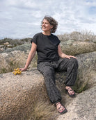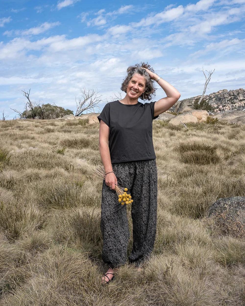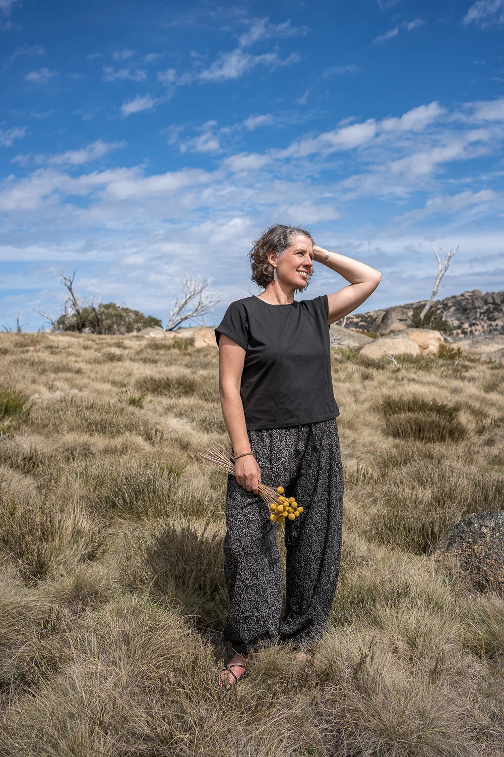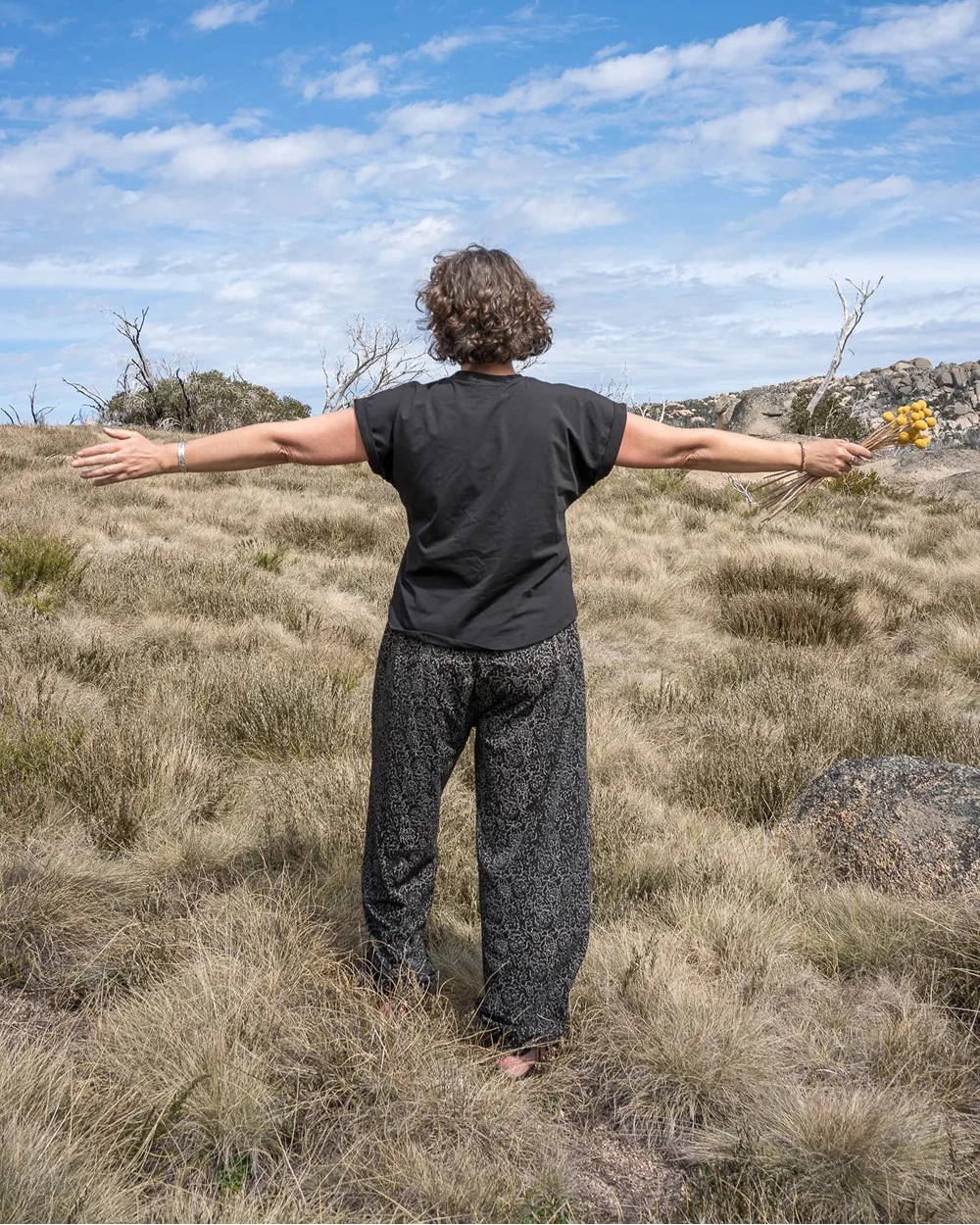 These comfy pants are crafted from dreamily soft and stretchy GOTS certified Organic Cotton Jersey. Perfect for yoga or just chilling at home, the laid-back relaxed design and fabulous print will mean you want to keep them on what ever you are up to.