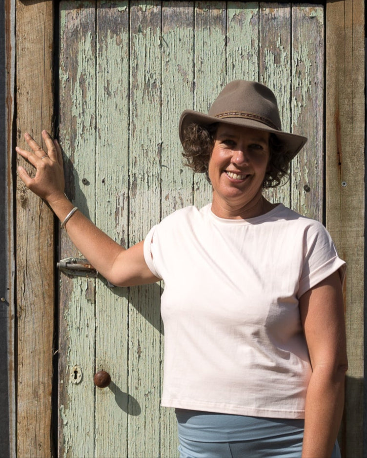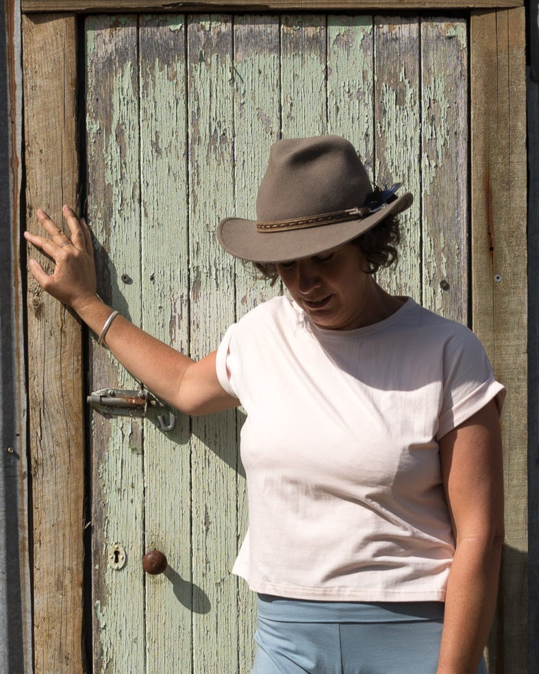 This really is the tee I wear every day. It's a simple, easy shape with a flattering hip length and a slightly longer curved hem at the back. The sleeves have a sweet little turn-up detail, and the fit is just right — size up for a relaxed look, or down if you like it a bit more fitted. It goes with everything: pants, skirts, even layers nicely under overalls. I think you’ll love it as much as I do.