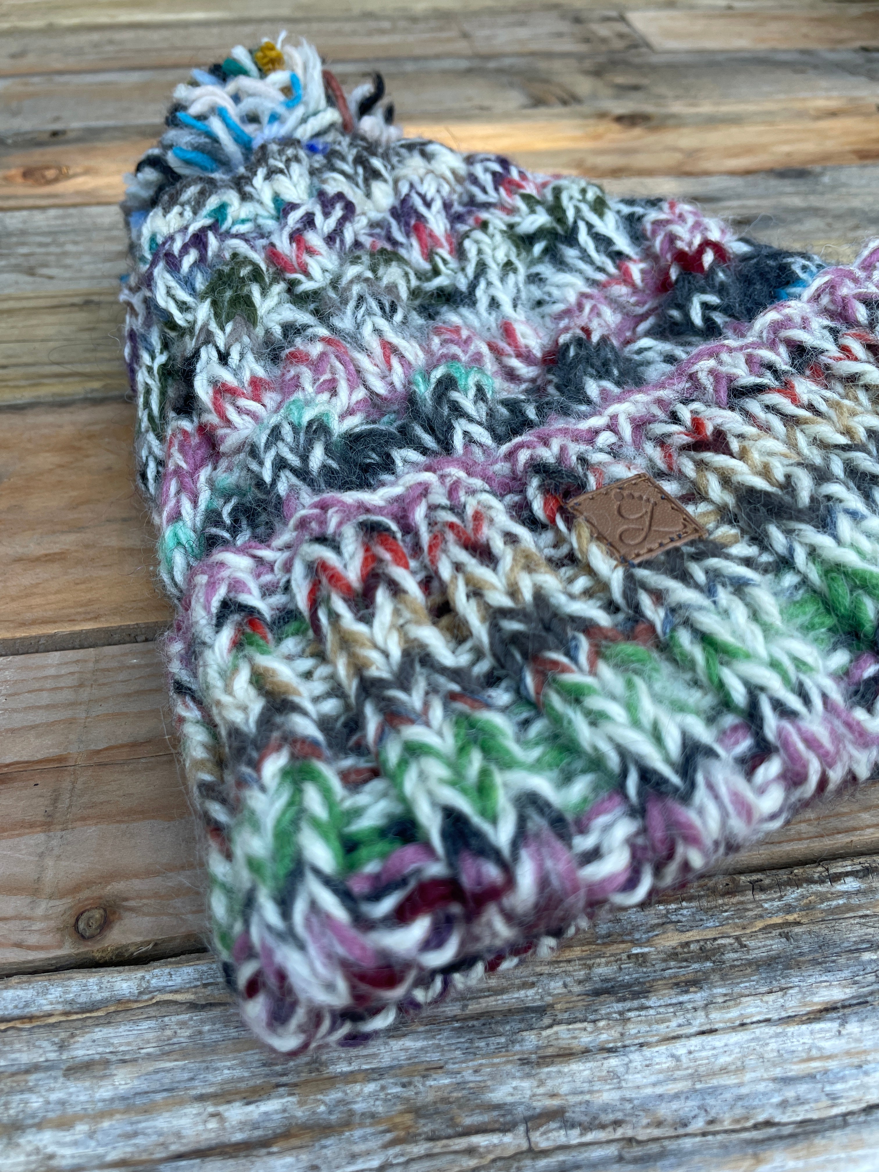 This bright and colourful beanie, with its pompom and cable knit, will cheer you up every time you put it on. The multicolour knit means it goes with pretty much anything - so you'll be reaching for it all winter. Hand-knit in Nepal from soft NZ wool it's ribbed turn up keeps it cosy around the ears and the fleece lining keeps the itch away and the warmth in.